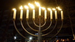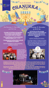 Öffentliches Anzünden der Chanukka-Kerzen mit dem Klezmer-Ensemble aus Israel, Grußworten, Chanukka-Quiz (mit Preisen), Sufganiot
