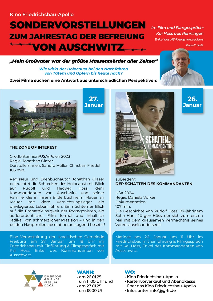 Filmvorführung zum Holocaustgedenktag: The Zone of Interest + Zu Google Kalender hinzufügen + iCal / Outlook export Datum 27.01.2025 Vorbei! Uhrzeit 18:00 Veranstaltungsort Kino Friedrichsbau Freiburg Kaiser-Joseph-Straße 268-270, 79098 Freiburg Website https://friedrichsbau-kino.de Kategorie Veranstaltung Teile diese Veranstaltung